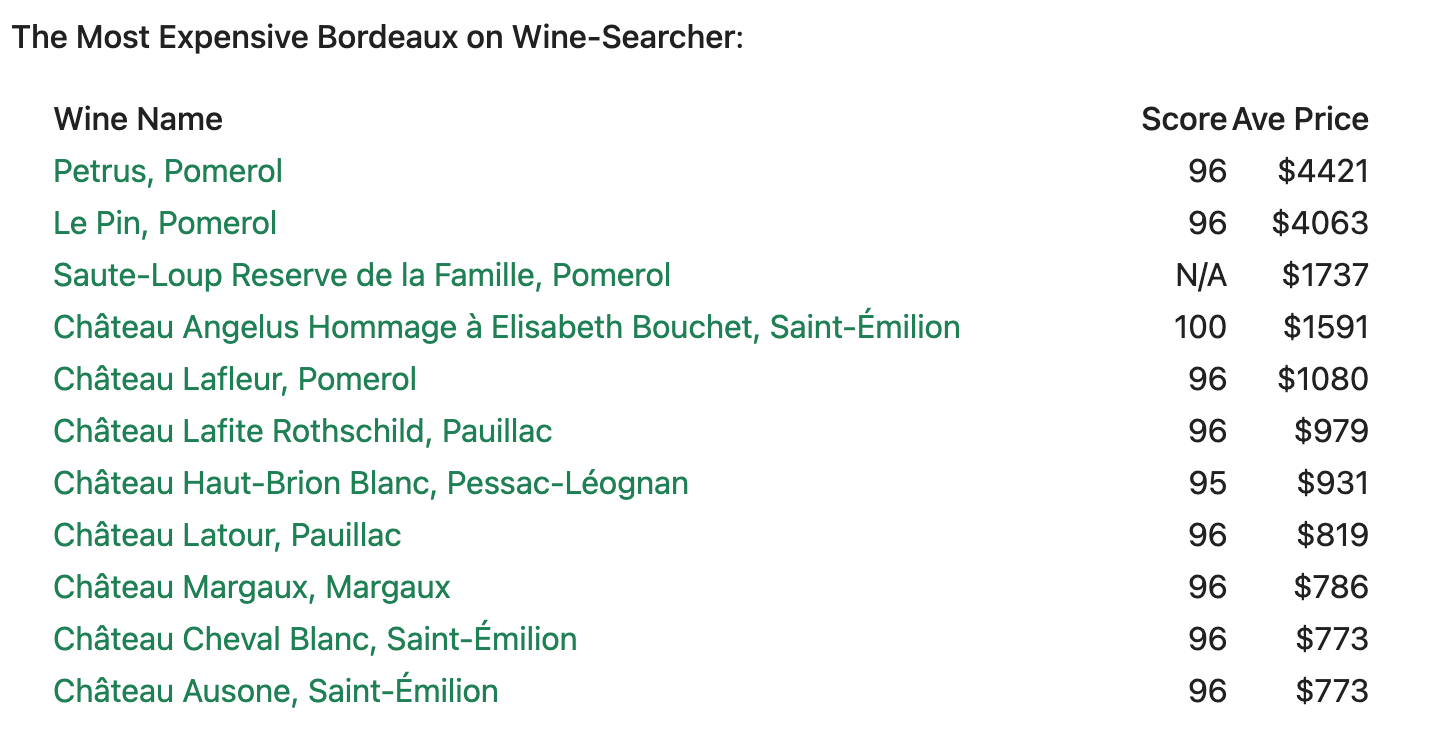 A new report by Wine-Searcher has called out the most expensive bottles of Bordeaux for 2023 (see image below). Some interesting points: